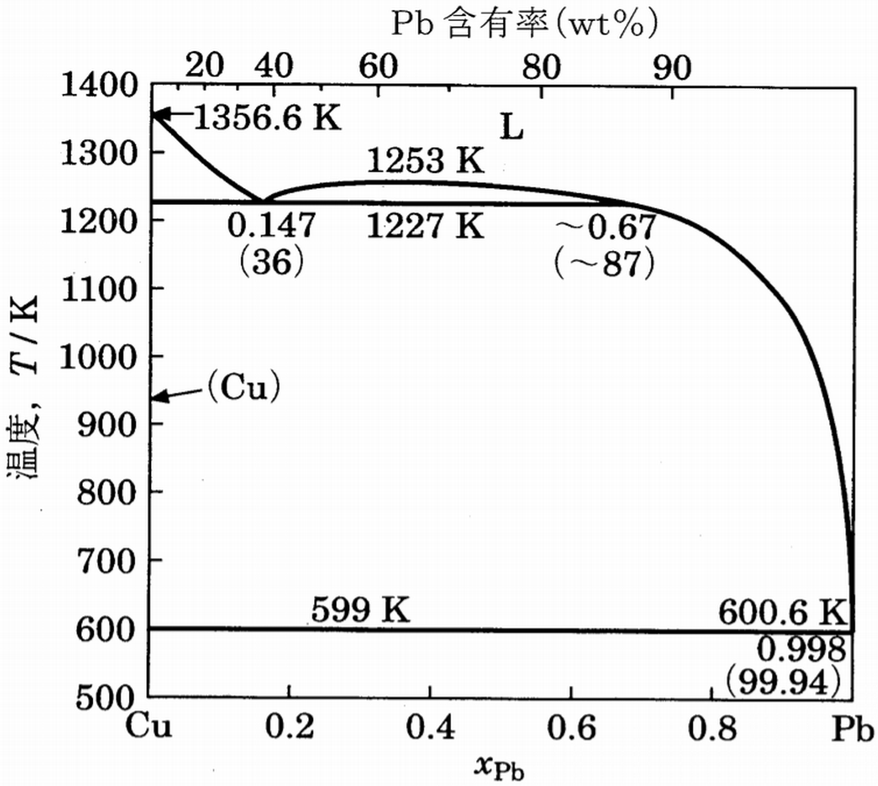(3)銅―鉛2元系では固体の銅, 固体の鉛, 液体の3相が平衡することはない。